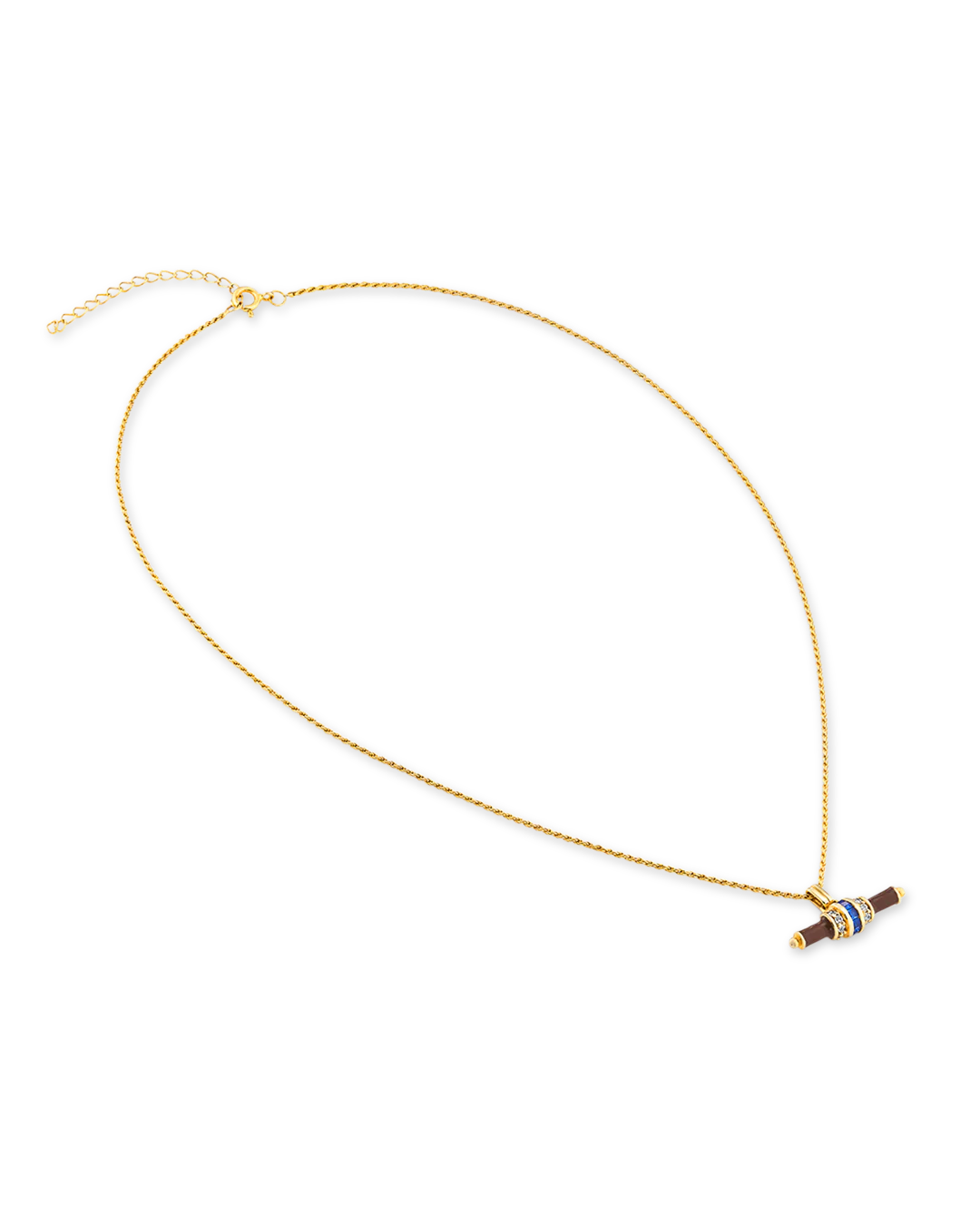 Presented on our staple V rope chain and inspired by our core style which is rooted in 1930s architectural design, the Bridget Necklace is an adaptation of our Marlowe design and the perfect balance of grandeur and utility; featuring a hand painted T-bar with brown enamel, set with white topaz and sapphire blue cubic zirconia stones.