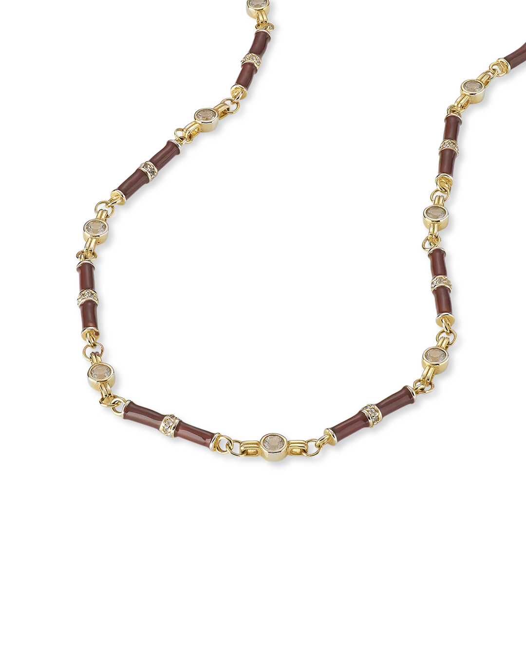 The Marlowe Necklace is crafted from 18 carat gold plated solid sterling silver, hand painted brown enamel and set with white topaz and champagne cubic zirconia.