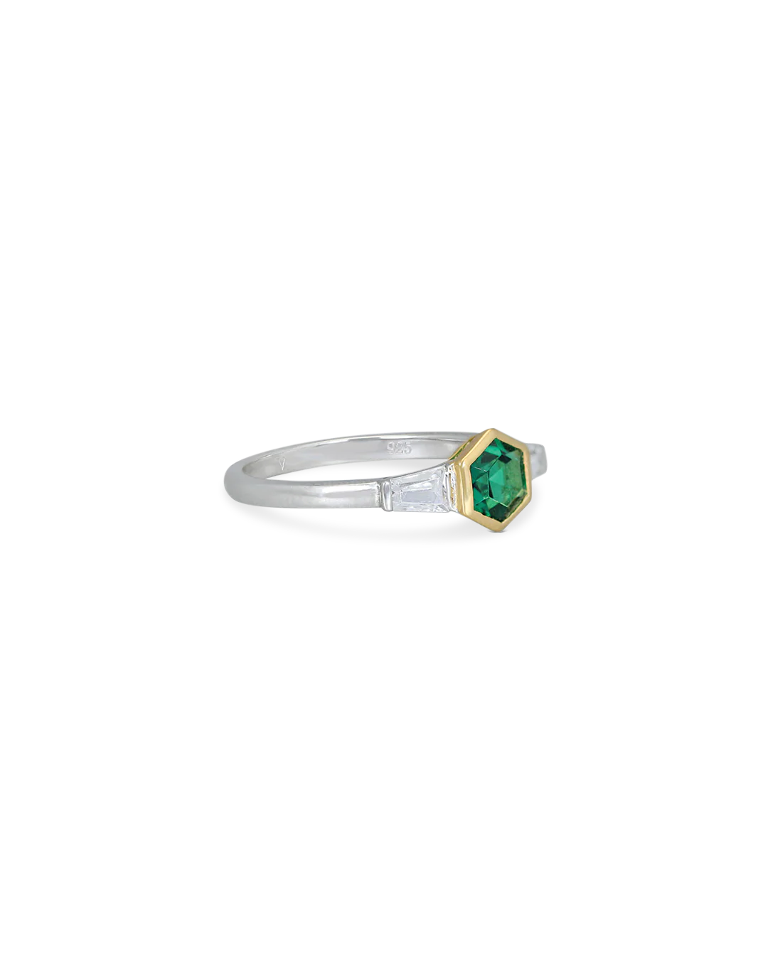 Both timeless and sustainable, the Darcy Gold Ring in Green from our AW19 Keep collection sees recycled and beautifully finished gold plated sterling silver set with hexagonal-shaped synthetic emerald and tapered baguette cut cubic zirconia.