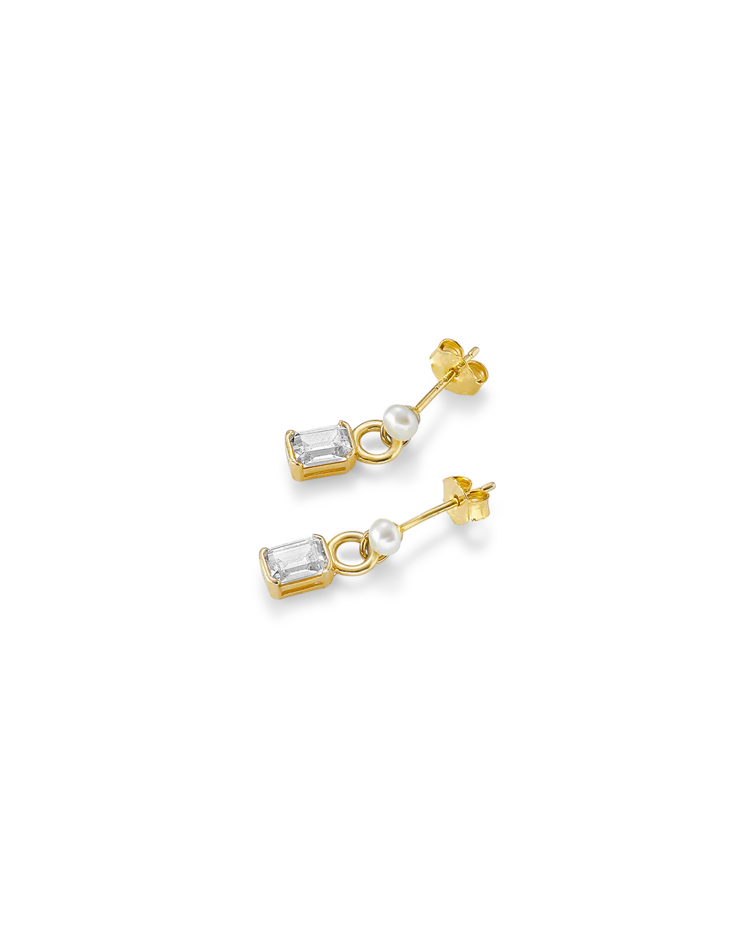 The delicate Elena Pearl Earrings feature a round freshwater pearl with a hanging step cut white topaz stone that moves as you do. Perfect for the beautifully understated bride or stacked alongside others for a more impactful look.