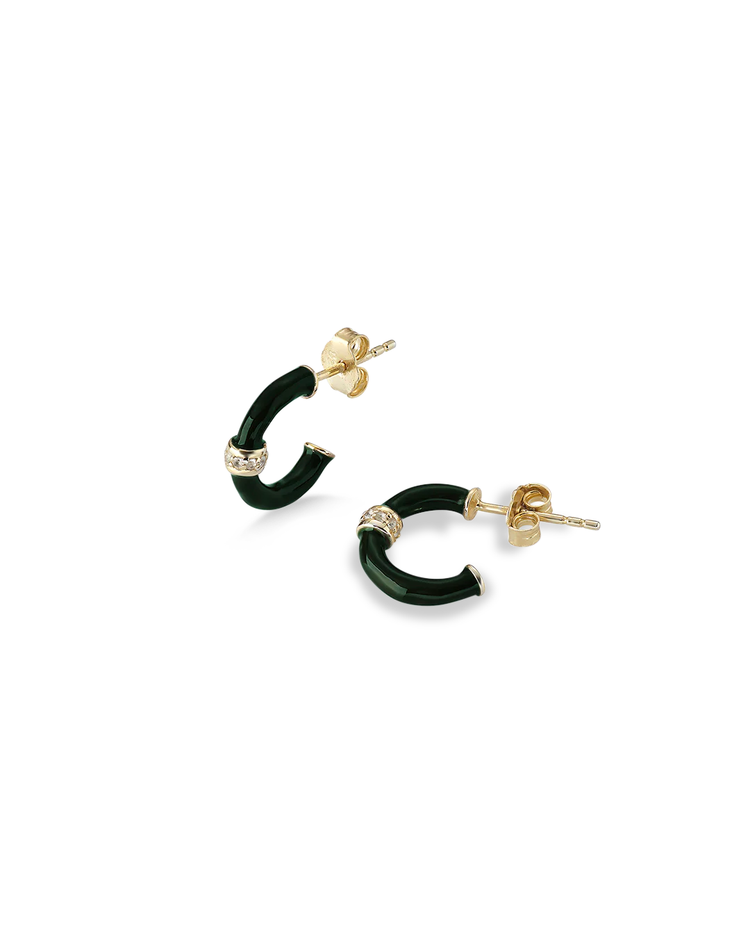 The Erin Hoops in deep green enamel have been designed to be the perfect size for everyday wear, and feature white topaz detailing for that added element. The enamel has been meticulously hand painted for a perfect finish.