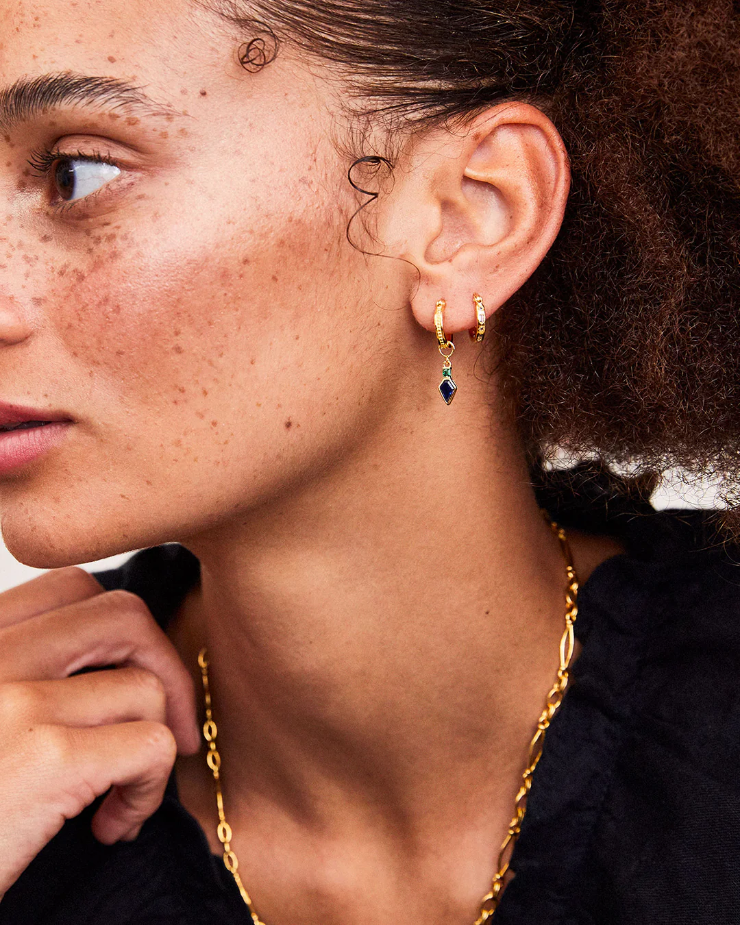 Featuring the most delicate of stonework - the Iris Gold Hoops are set with alternating baguette and round clear cubic zirconia. Customise your hoops by adding your choice of detachable charms for a two-in-one earring look that transitions you from day to night.