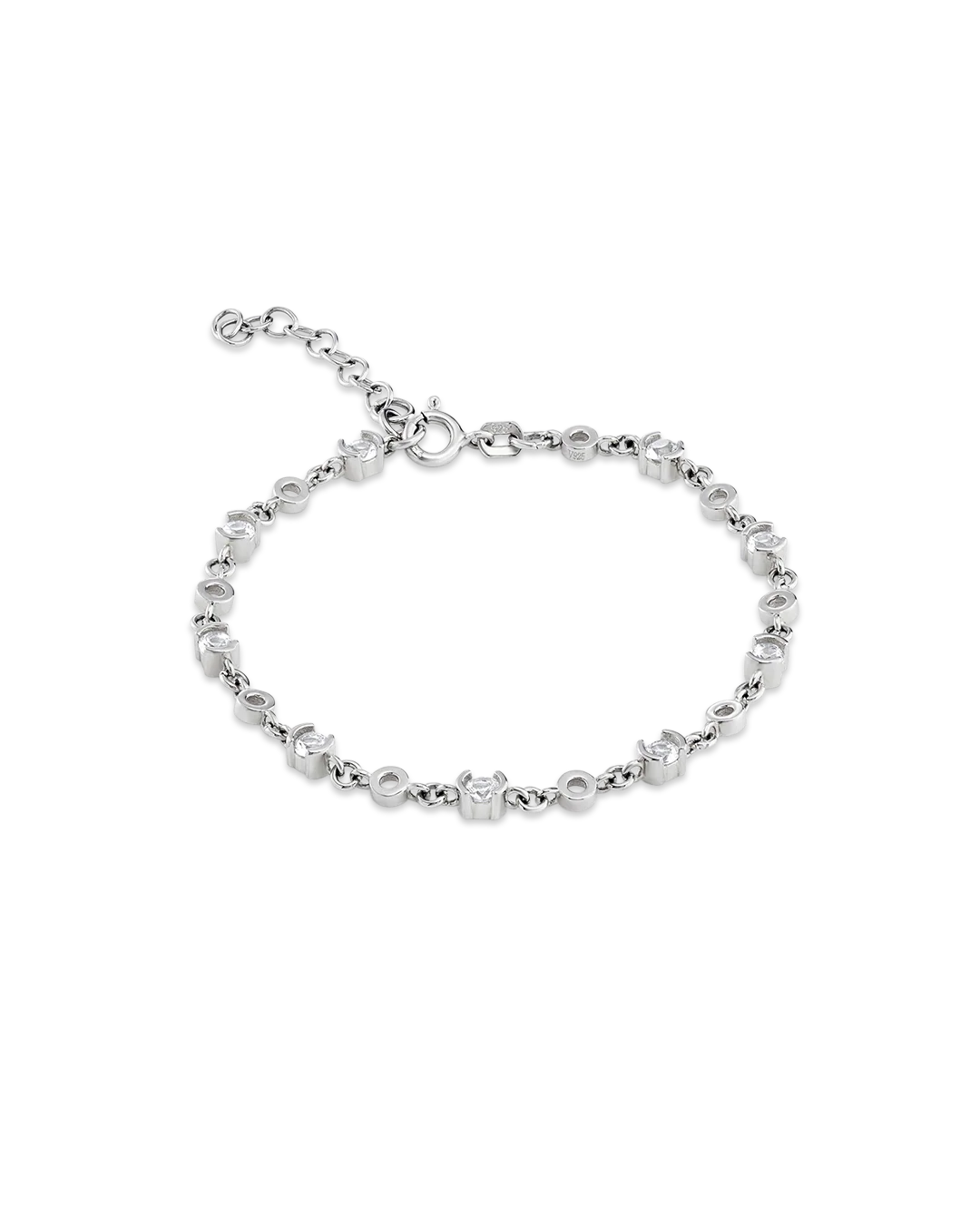 A culmination of V's bygone hero pieces and taking inspiration from V founder and designer Laura's own wedding band, the Lyla silver fine bezel bracelet features an alternating semi bezel setting of meticulously set round brilliant cut white topaz stones.