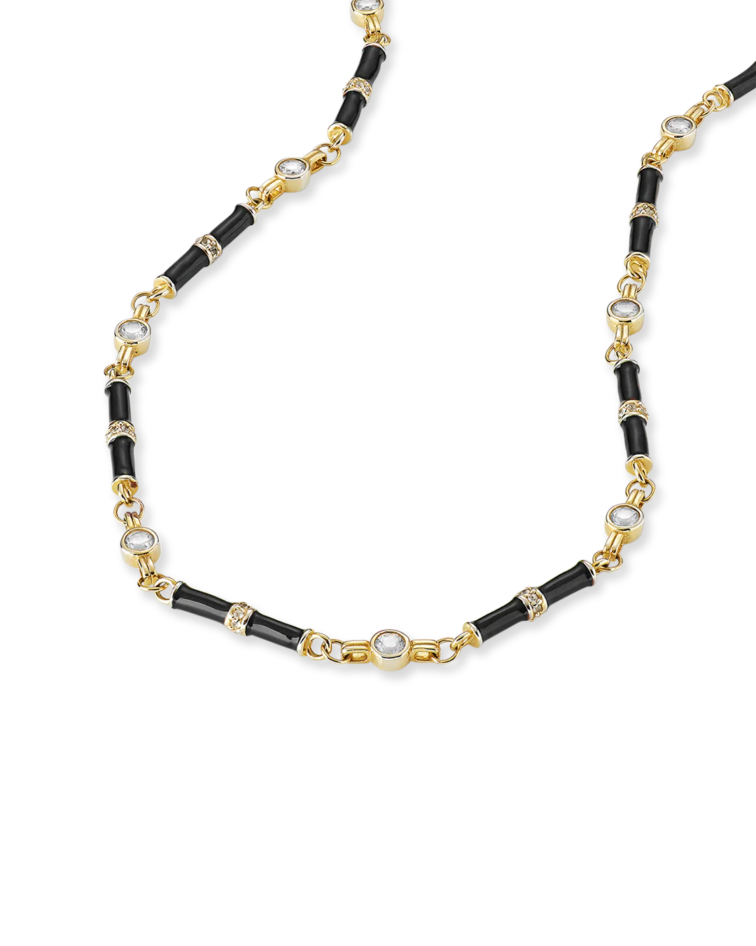 The Marlowe Necklace is crafted from 18 carat gold plated solid sterling silver, hand painted black enamel and set with white topaz.