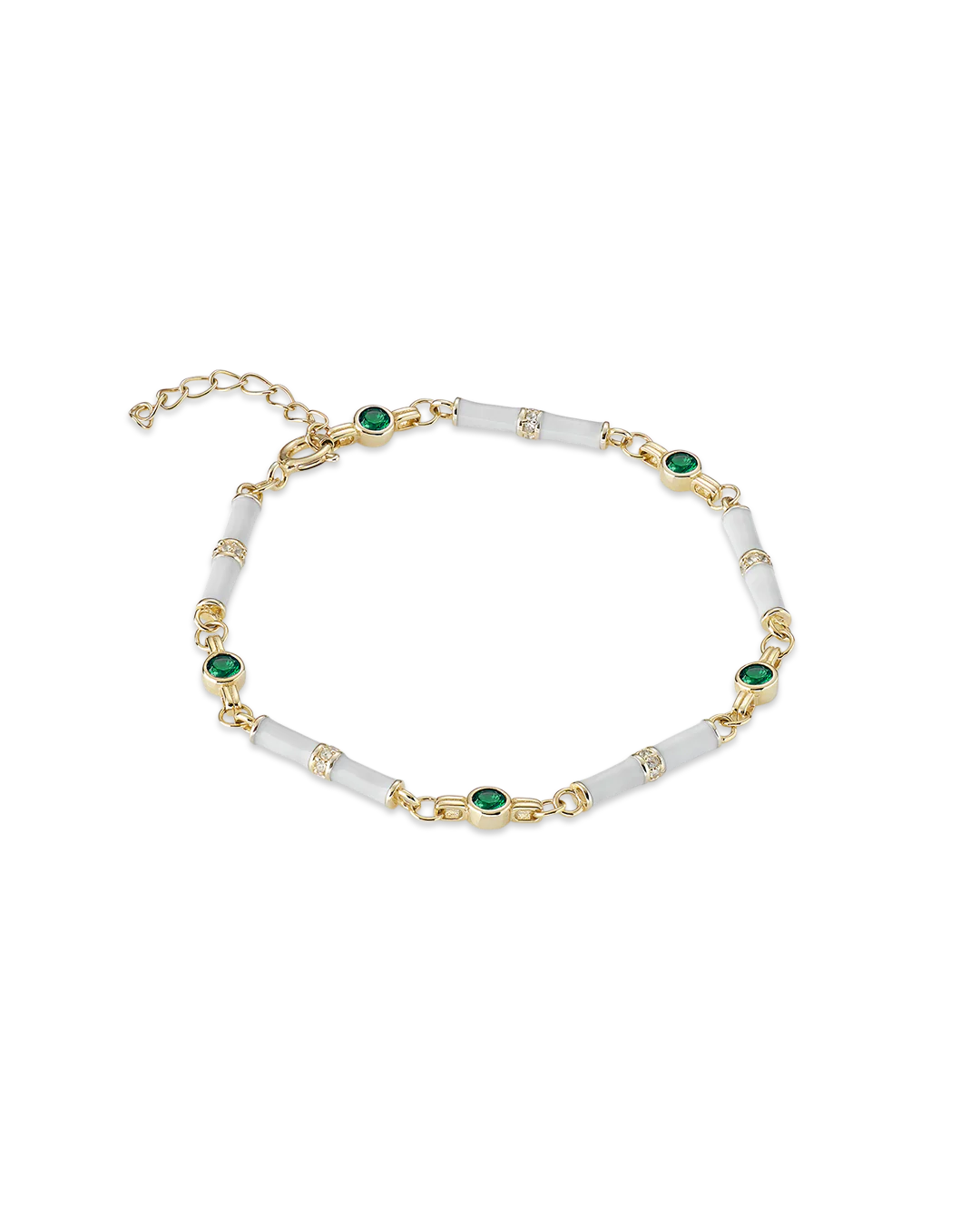 The Marlowe Bracelet is crafted from 18 carat gold plated silver, hand painted white enamel and set with white topaz and emerald green cubic zirconia.