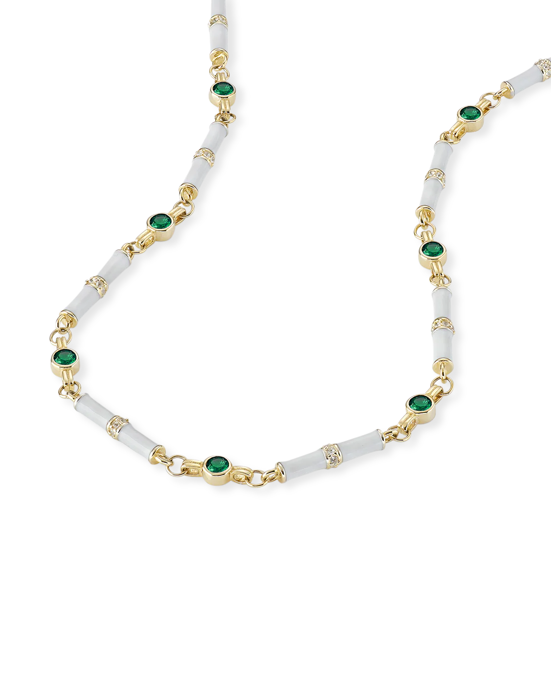 The Marlowe Necklace is crafted from 18 carat gold plated solid sterling silver, hand painted white enamel and set with white topaz and emerald green cubic zirconia.
