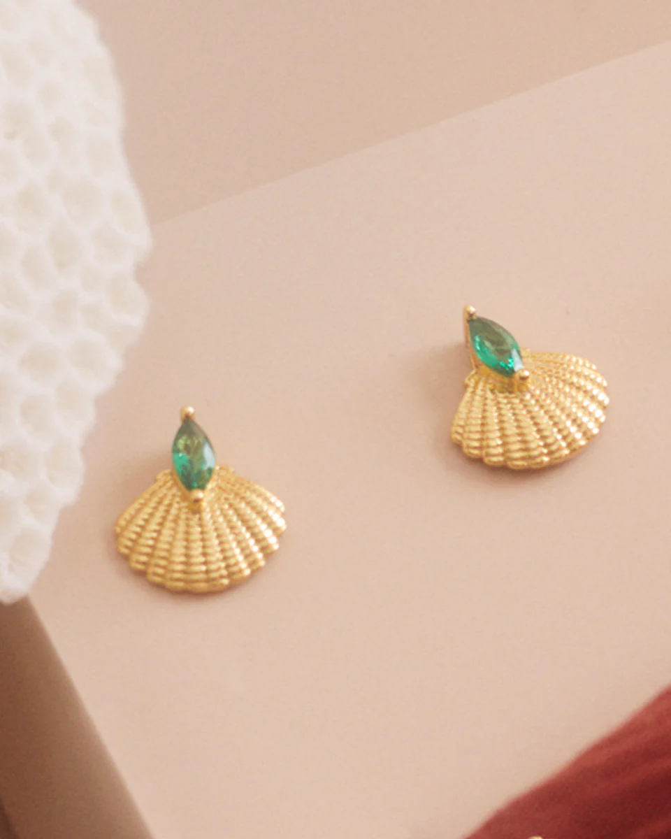 Marine inspired, the shell shape of Pamela Gold Shell Earrings sits perfectly to frame the ear lobe, while a green and gold colour combination captures admiration.