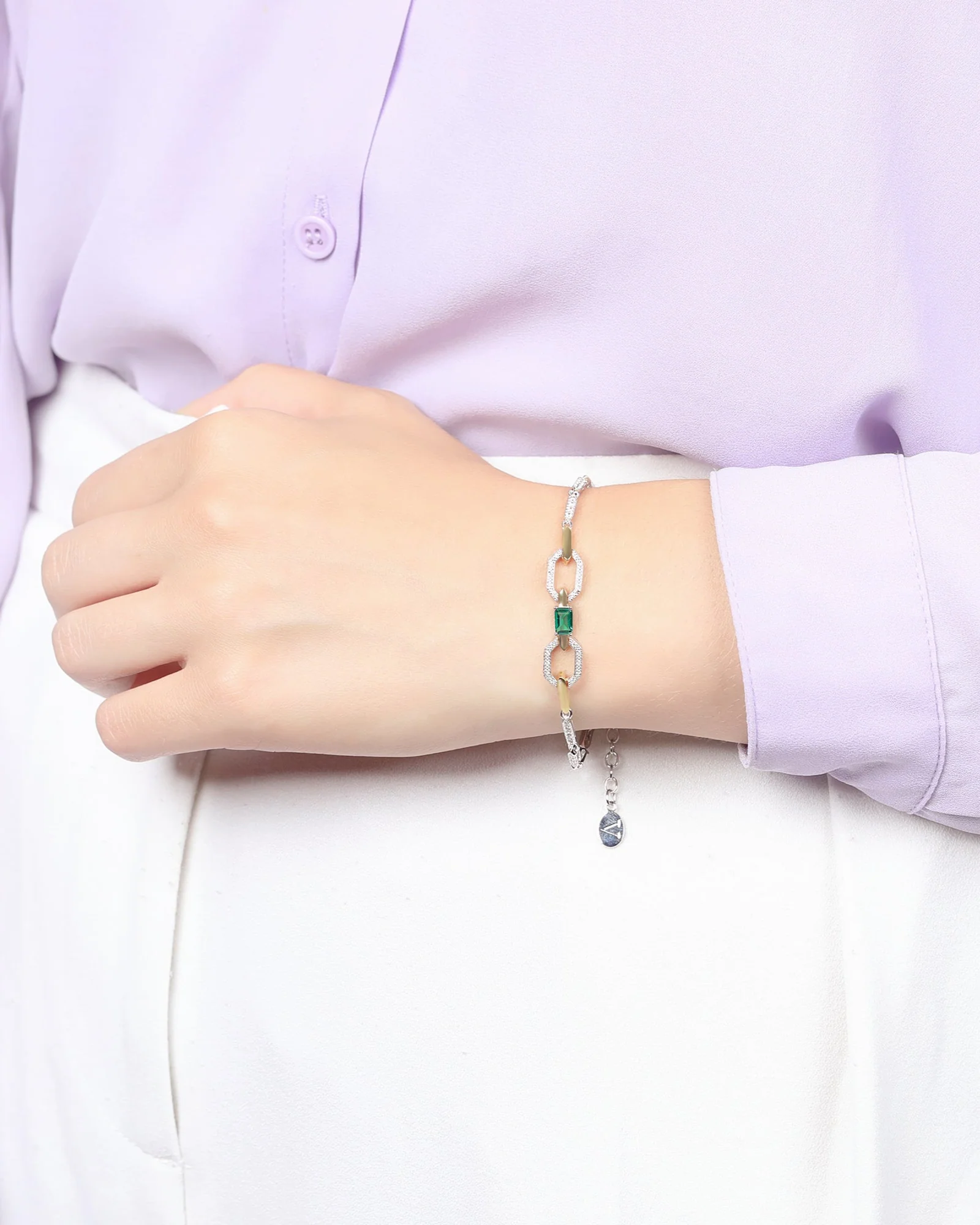The Thalia Sterling Silver Bracelet comprises of 120 meticulously hand set cubic zirconia stones and a claw set green nano, this two tone plated bracelet measures 6.75" plus a one inch extender and features fluid hinge work throughout.