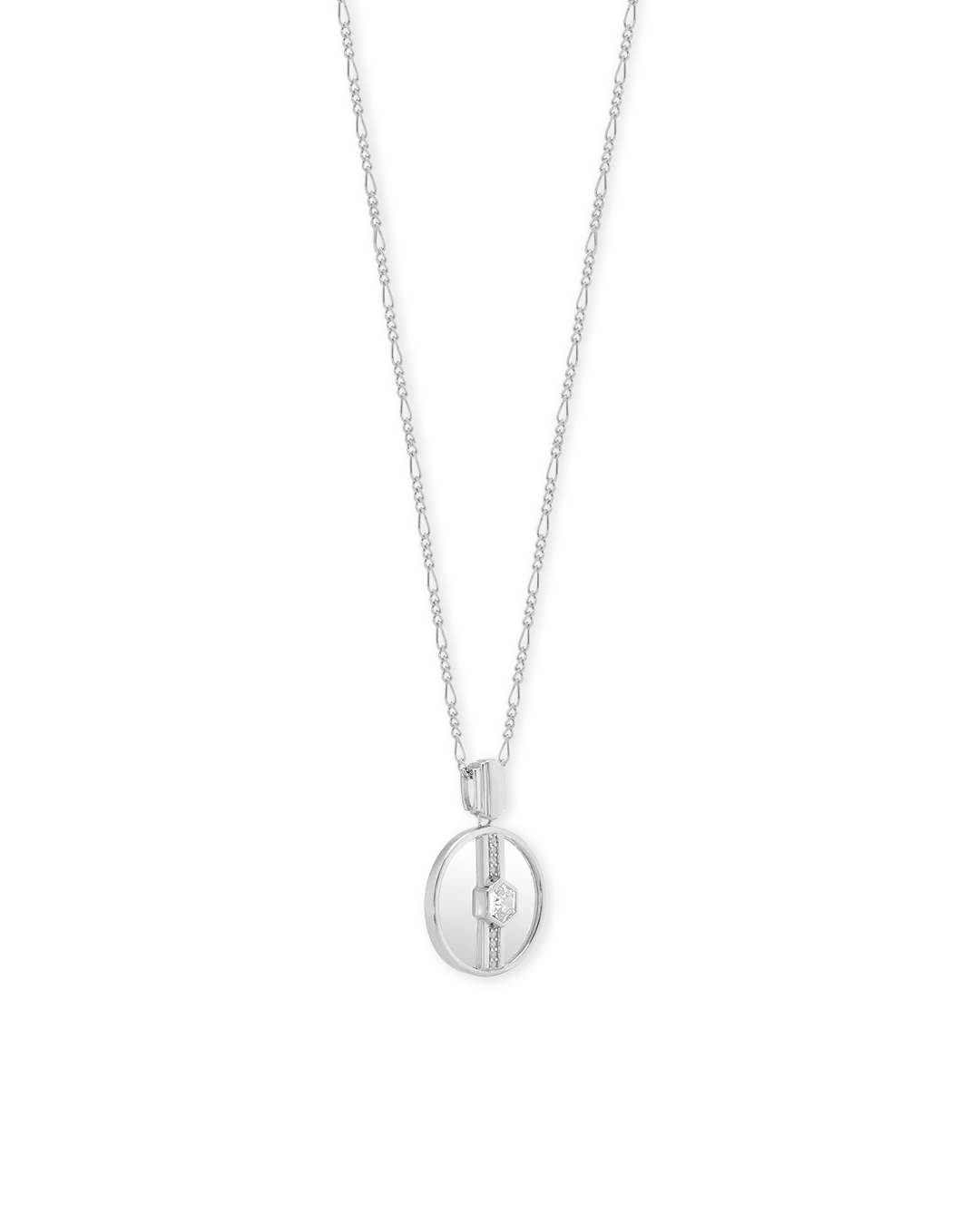 The clever design of the Vivica Glass Necklace in Silver acts as a two dimensional interpretation of vintage perfume bottles. Vivica sees cubic zirconia complement glass sheets that echo the appearance of ornate perfume bottles, using the larger central cubic zirconia to further the reflective abilities of the glass. The ridged edges of the bail that echoes vintage perfume lids and the beautifully polished silver that runs straight through the pendant, emulates the delicate glass cuttings of intricately designed perfume bottles.